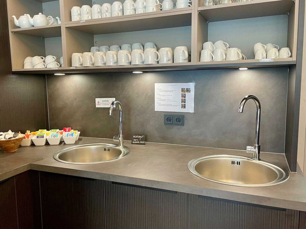 Our drinking water tap in the breakfast room is available to you at any time. Filtered sparkling and still water comes from the right-hand faucet, and boiling tea water from the left. Detailed instructions, as well as cups, glasses, and tea bags, are located nearby.